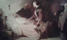 Desde el personaje pasamos a la última parte de esta interesante exposición, donde se muestra la creación del mito de Cervantes. En Europa la obra cervantina va triunfando, generalmente a base de hacer reir. Pero en Inglaterra la valorarán de otra manera y allí empiezan los escritores a ver en Cervantes un modelo a imitar. Podemos contemplar la segunda parte de el Quijote en una edición inglesa de 1620. Durante el s.XIX revive el mito de Cervantes. La guerra de África (1859-60) nos acerca a sus vivencias, así como el gusto por el exotismo oriental que tienen los artistas y la sociedad del momento. La primera escultura pública de Miguel de Cervantes se levantó en junio de 1835 en Madrid, en la plaza de las Cortes. Después vendrían más, como la estatua frente a los arcos de entrada a la Biblioteca Nacional o el famoso monumento a Cervantes de la Plaza de España (Se pueden ver todas las facetas de su creación hasta que se colocó). Del pintor valenciano Muñoz Degrain se expone su obra "Cervantes escribiendo la dedicatoria de su obra al Conde de Lemos" (1916. Biblioteca Nacional). Hoy en día Sancho y Quijote son todo un símbolo de España y objeto para los turistas. Pero el cervantismo es todo un modelo de vida, donde escritores como Ortega, Unamuno, Menendez Pidal se inspiraron. Muy aclaratorias las palabras finales de Javier Gomá: "El nuevo ideal es Cervantes. Si el Quijote fue el libro de la conciencia moderna, la perdurable imagen de su autor está llamada a valer de gran mito post-moderno. España sería mejor, más cívica, más urbana, más humana, si imitara más su ejemplo, si fuera más cervantina". Con estas últimas imágenes me despido animándolos a darse una vuelta y ahondar en esta exposición.